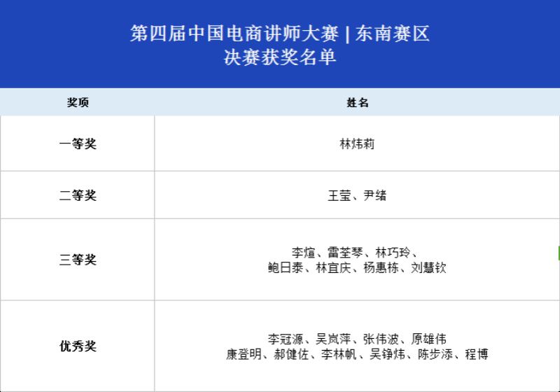 10月27日,第四届中国电商讲师大赛东南赛区比赛在福建莆田圆满落幕。经过8小时的激烈角逐和层层选拔,共有10名选手晋级全国半决赛,他们将于12月与其他分赛区晋级选手会师全国总决赛。