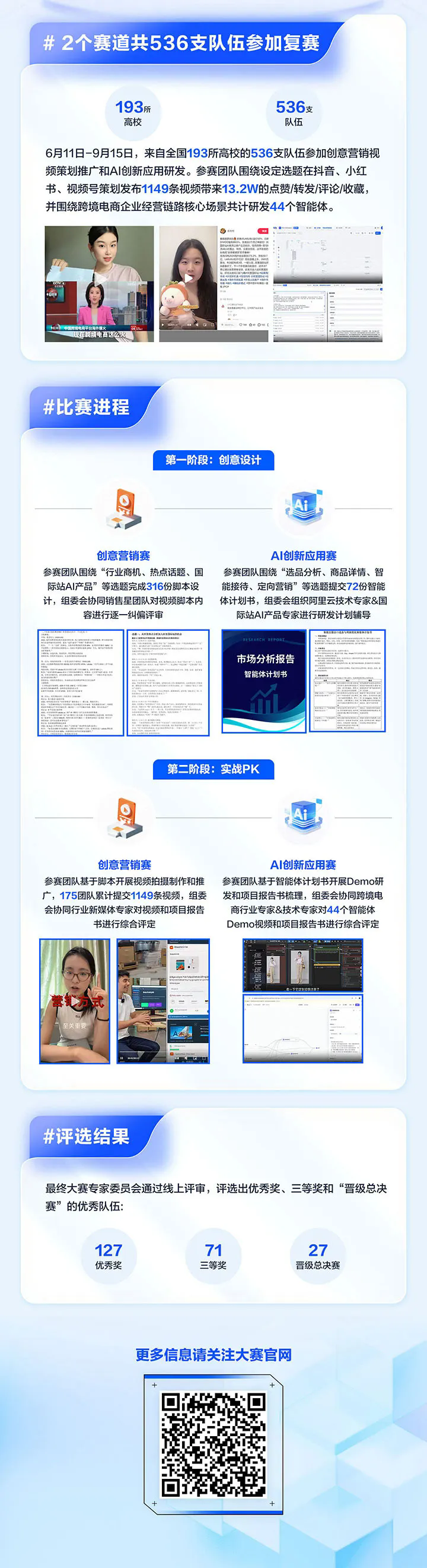 6月11日-9月15日,第二届全国大学生跨境电商创新创业大赛【创意营销赛】&【AI创新应用赛】展开复赛,来自全国193所高校共536支队伍参加创意营销视频策划推广和AI创新应用研发。参赛团队围绕设定选题在抖音、小红书、视频号策划发布1149条视频带来13.2W的点赞/转发/评论/收藏,并围绕跨境电商企业经营链路痛点和核心场景共计研发44个智能体。
